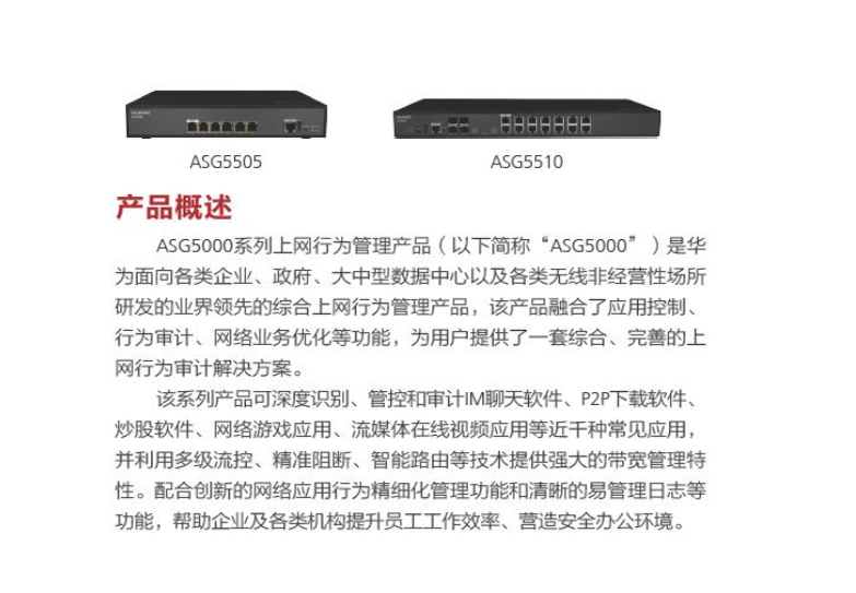 ASG5000系列上網行為管理產品(以下簡稱“ASG5000”)是華為面向各類企業、政府、大中型數據中心以及各類無線非經營性場所推出的業界領先的綜合上網行為管理產品。