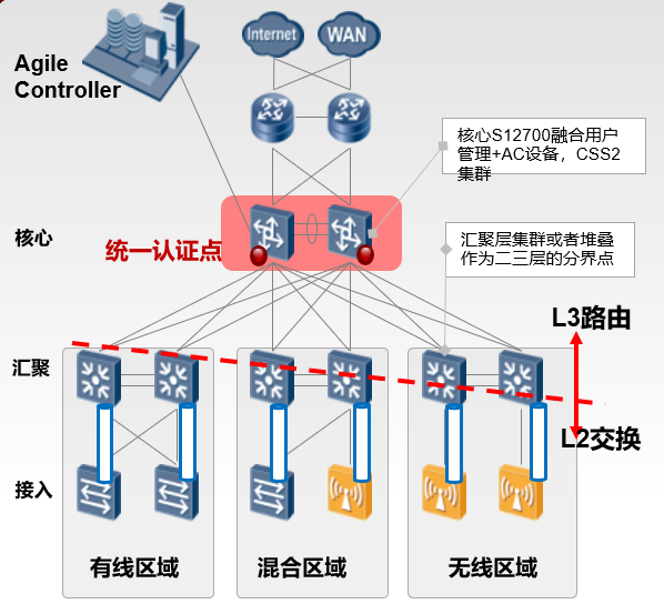 三層網絡,認證點只能分散部署于各三層網關設備,不便統一認證和管理